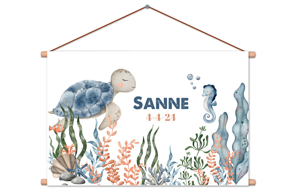 Breng de onderwaterwereld naar de kamer van je kindje met een prachtige textielposter! Deze unieke poster toont de naam van je kindje in speelse, kleurrijke letters, omringd door een vrolijke schildpad en andere betoverende zeedieren. De schildpad, met zijn heldergroene schild en schattige ogen, zwemt speels tussen kleurrijke vissen, zeester en een schattig zeepaardje.