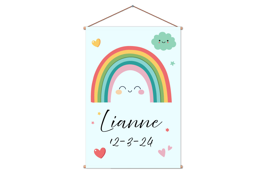 Een textielposter met de naam van je kindje en een vrolijke regenboog is een prachtige en persoonlijke toevoeging aan de kinderkamer. Deze decoratieve poster straalt niet alleen warmte en liefde uit, maar ook een speelse sfeer dankzij de kleurrijke regenboog.
