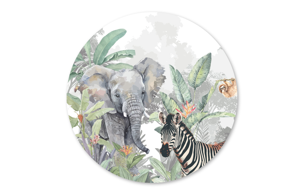Een muurcirkel met een jungle-thema waarop een olifant en een zebra te zien zijn, brengt direct een gevoel van avontuur en natuurlijke schoonheid in je interieur. De majestueuze olifant, vaak symbool voor kracht en wijsheid, staat statig tussen het groene gebladerte, terwijl de sierlijke zebra met zijn iconische zwart-witte strepen een speelse en levendige uitstraling toevoegt. Samen creëren ze een dynamisch contrast van kracht en elegantie in een weelderige jungleomgeving, vol diepgroene bladeren en mysterieuze schaduwen. Deze muurcirkel voegt een exotische en rustgevende sfeer toe aan elke kamer, woonkamer of kinderklamer perfect voor een stijlvolle en natuurlijke touch.