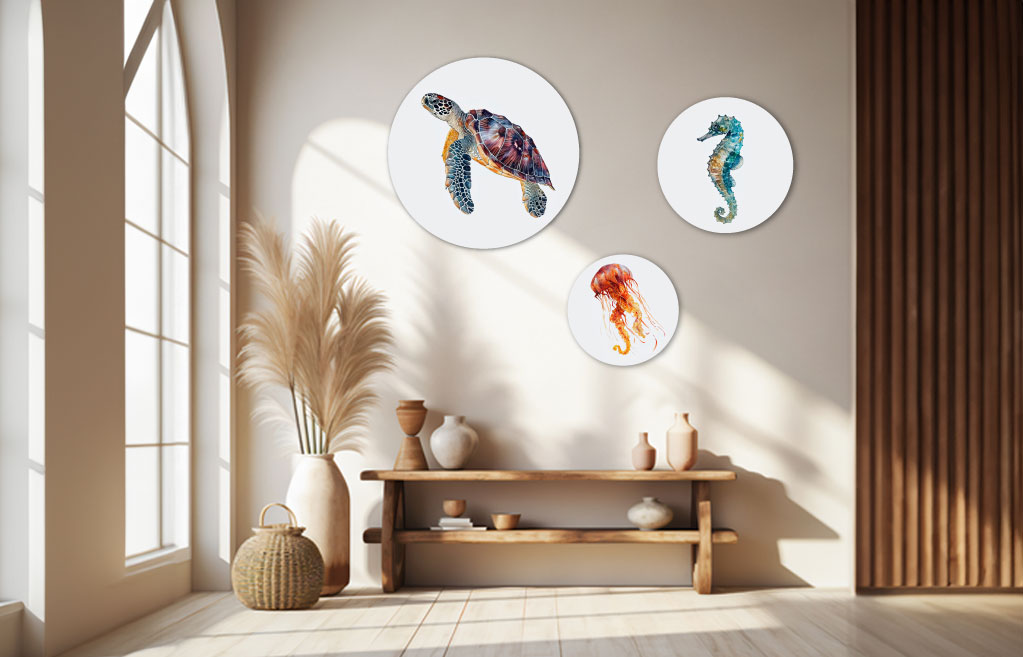 Het beeld van de zeeschildpad straalt kracht en vrijheid uit, wat zorgt voor een inspirerende uitstraling in de kamer. Of het nu in een woonkamer, slaapkamer of kantoor hangt, deze muurcirkel brengt een stukje van de magische onderwaterwereld naar binnen. Het is een perfecte keuze voor liefhebbers van de natuur en de oceaan, en voor iedereen die een uniek, artistiek element aan hun ruimte wil toevoegen.