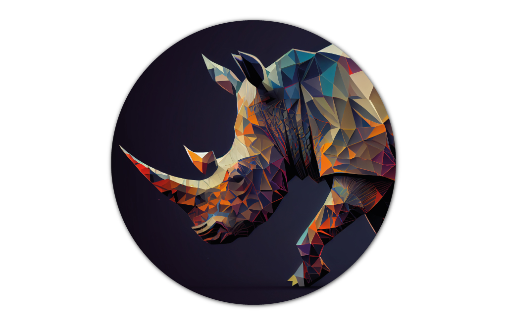 In deze unieke muurcirkel wordt de neushoorn afgebeeld in een abstracte en geometrische stijl, waarbij de natuurlijke vormen van het dier worden gereduceerd tot een reeks hoekige lijnen en vlakken. Dit creëert een visueel intrigerend contrast tussen de organische essentie van de neushoorn en de strakke, moderne esthetiek van geometrie.