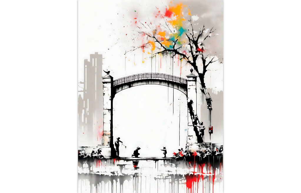Een plexiglas bord met graffiti in de stijl van Banksy street art is een opvallende combinatie van moderniteit en urban kunst. Het transparante materiaal van plexiglas biedt een subtiele, bijna zwevende achtergrond waarop de krachtige en vaak maatschappijkritische kunst van Banksy zich kan ontvouwen. Banksy, beroemd om zijn sjabloon-techniek en scherpe politieke commentaar, maakt gebruik van sterke beelden en ironische boodschappen die de kijker aan het denken zetten.