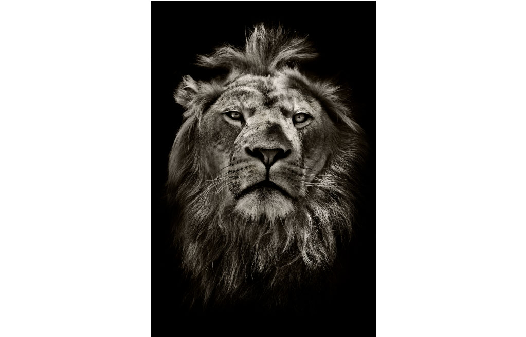 De zwart-wit compositie geeft het bord een tijdloos karakter, waardoor het moeiteloos past in verschillende interieurs, van minimalistische moderne woonkamers tot chique werkruimtes. De leeuwenkop, weergegeven in scherpe lijnen en contrasterende tinten, benadrukt de majestueuze kenmerken van het dier, zoals de krachtige manen en de indringende ogen. Het licht dat door het plexiglas wordt gereflecteerd, kan subtiele schaduwen werpen, wat het visuele effect versterkt en het kunstwerk een extra dimensie geeft.