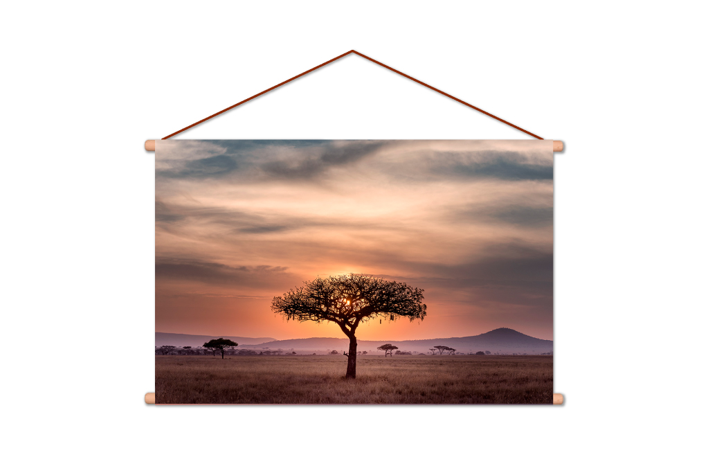 Deze textielposter is ontworpen met rijke, natuurlijke kleuren die de levendigheid van de savanne weerspiegelen. Van de warme tinten van de ondergang van de zon, die de lucht in een palet van oranje, rood en paars kleurt, tot de heldere groenen van de grasvelden, elk detail is zorgvuldig gekozen om een gevoel van ruimte en vrijheid te creëren.